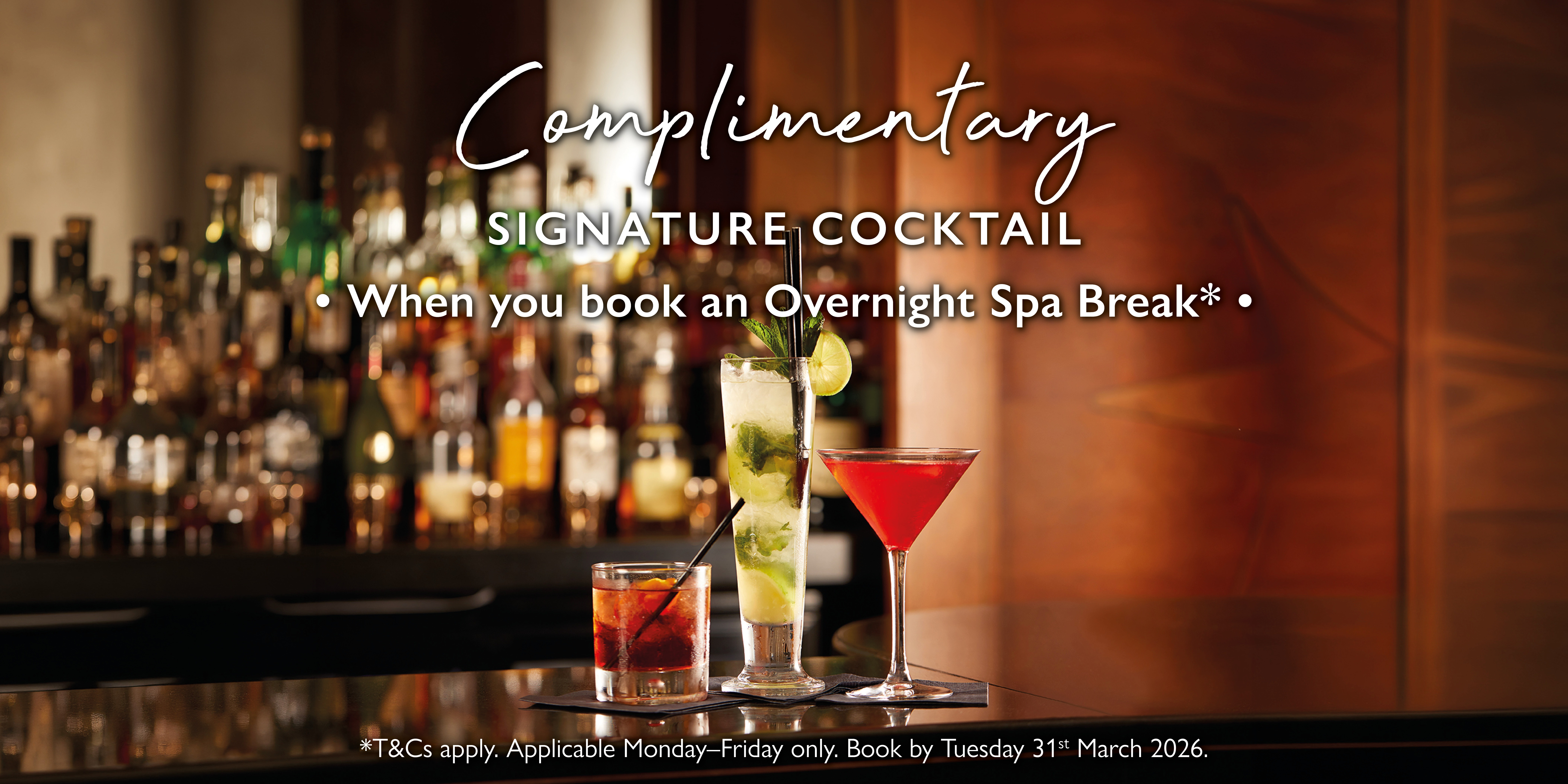 Complimentary Signature Cocktail -Includes one complimentary Signature Cocktail per adult per stay, served in the hotel bar. Valid for new bookings made 2nd–31st March 2026, for stays 2nd March–30th April 2026. Monday–Friday arrivals only. Excludes Sunday Spa Break packages. Subject to availability.