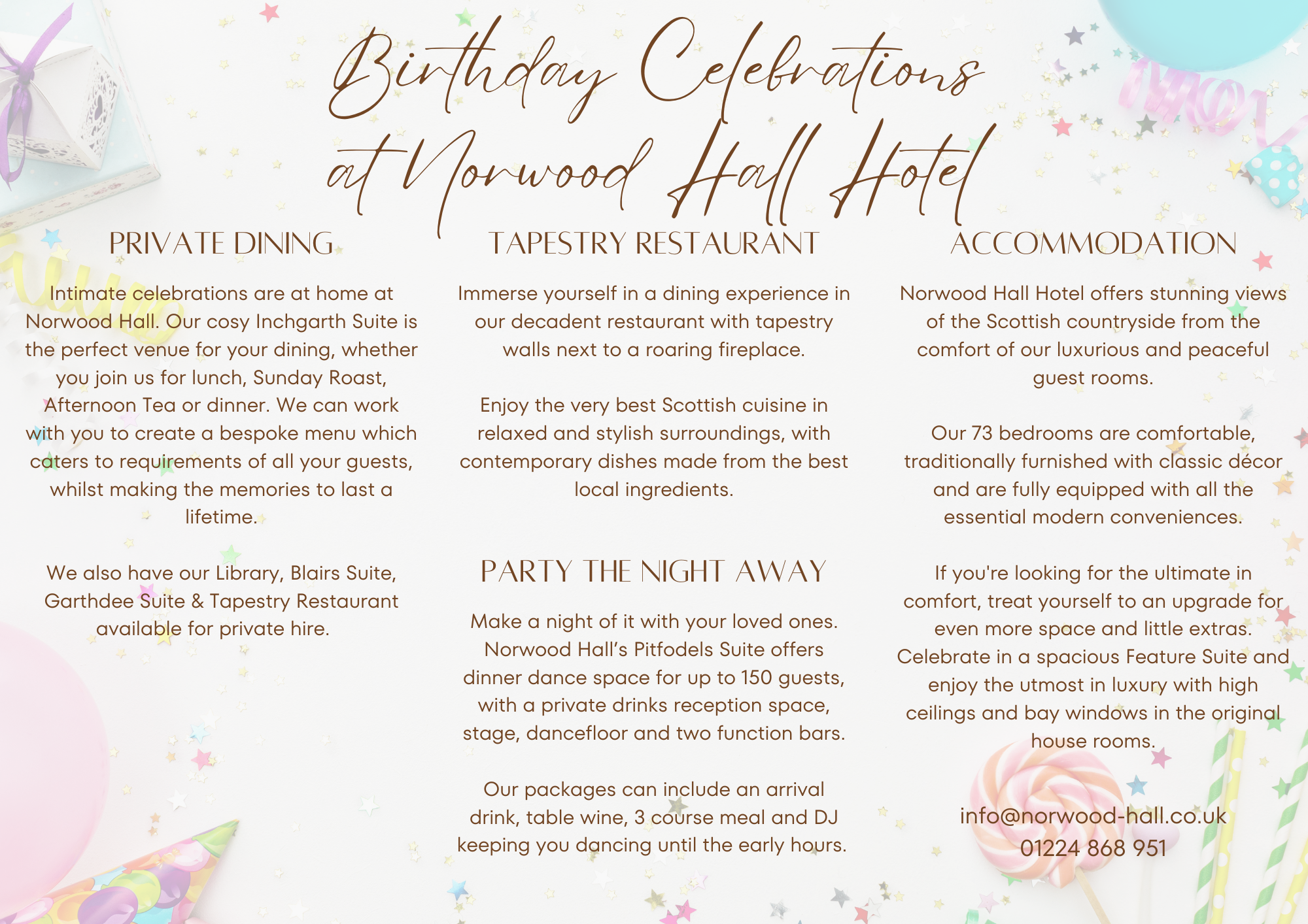 Celebrate your birthday in style at Norwood Hall Hotel. Whether it's private dining or the party of the year, Norwood Hall in Aberdeen is the place to be.