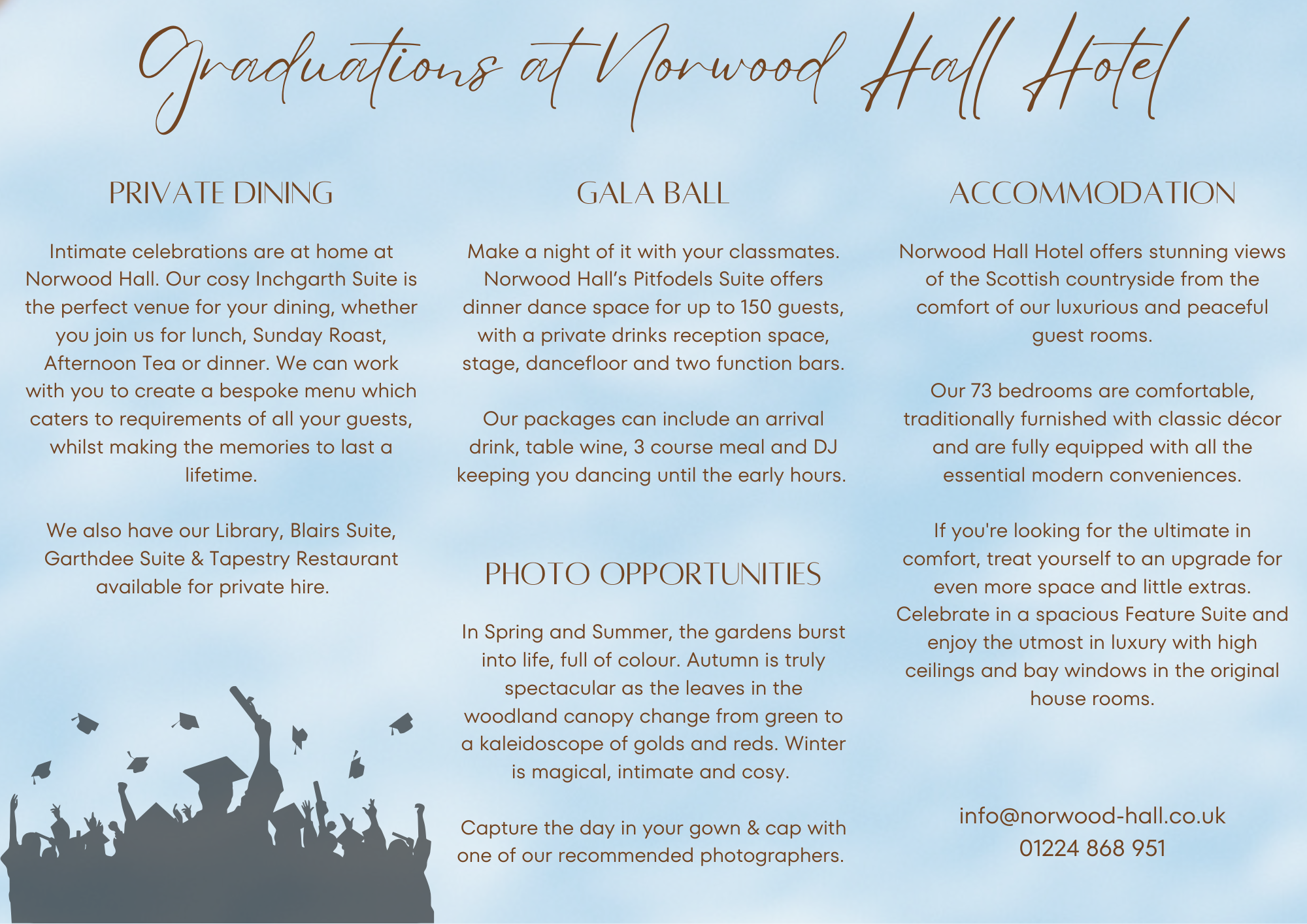 The team at Macdonald Norwood Hall Hotel would love to congratulate you in all your achievements, and celebrate your success at this important milestone.